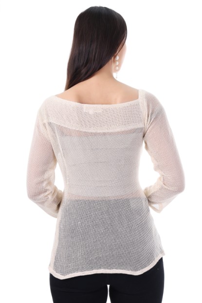 - Features: Thread net top for women features a boat neckline, long flared sleeves, sheer mesh, hollow out fishnet, solid color, high stretch, and diamante detailing all over. A dazzling array of faux diamond join forces to form this stunning piece.